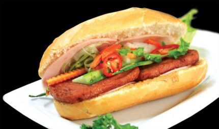 Spam Ham Banh Mi – A tasty Vietnamese baguette layered with savory spam, deli-style ham, pickled vegetables, cucumber, cilantro, and a flavorful house-made sauce. A fun, satisfying twist on the classic bánh mì.